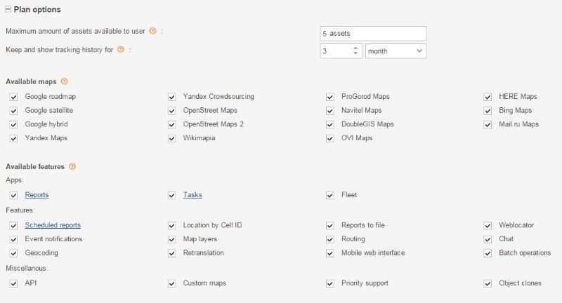 You can define what particular tools and features will be available to your users on each tariff plan, i.e. Reports, Tasks, Fleet, Weblocator, Event Notifications, etc. Feel free to manage your tariff plans as you like.
