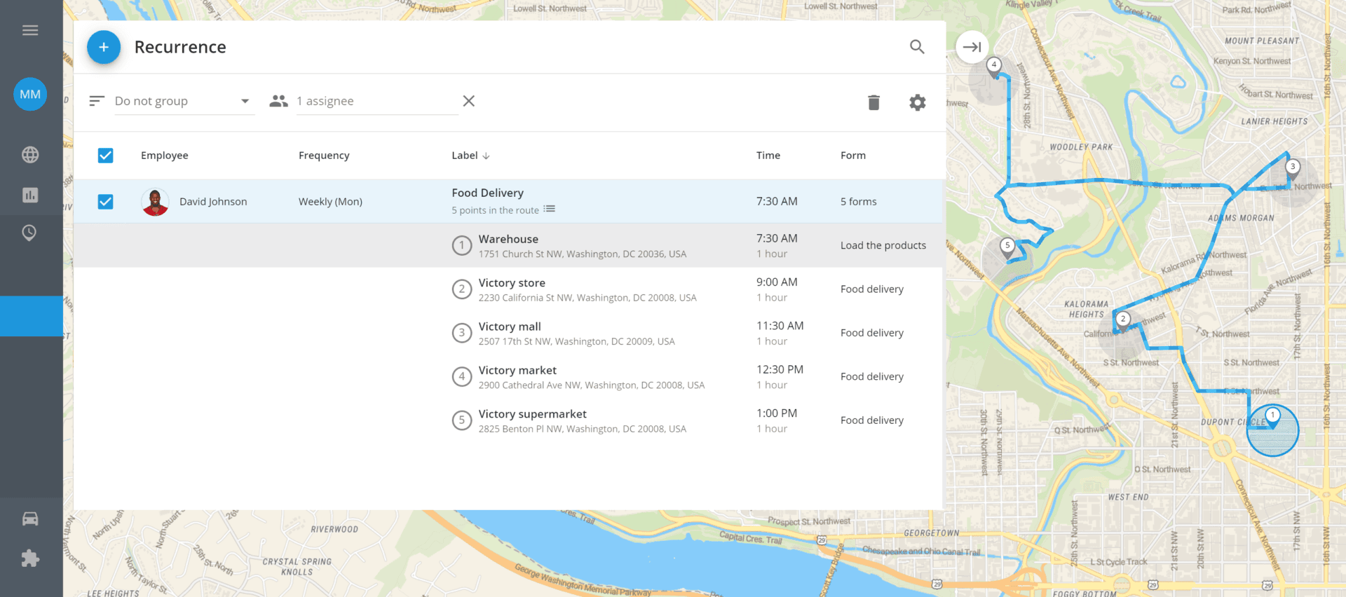 Imagine the following situation: as a fleet operator at a distribution company, you manage routes that repeat on a weekly or monthly basis. For example, each Monday a driver Anthony delivers groceries to supermarkets in the southwest part of Washington, DC. To do this, he first has to visit a warehouse located in Brentwood to load the items. Only after that, he can start delivering groceries to the supermarkets.