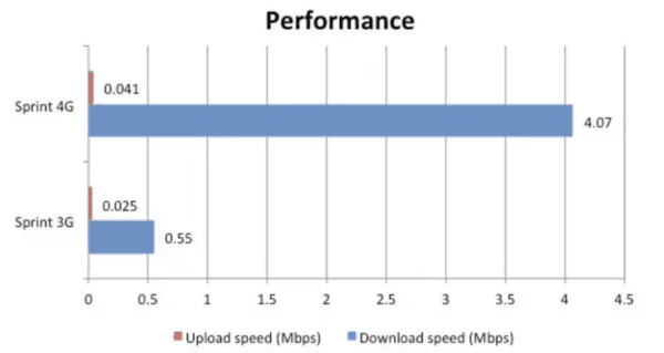 The graph below is a real-life comparison of Sprint’s 3G versus 4G upload and download speeds. Notice that 4G is nearly eight times faster than 3G at downloading.