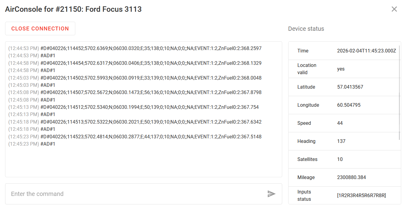 Air Console enables technical specialists, such as technical support team members, to monitor all messages sent by the tracker to the server and send commands to the device if supported. Powered by WebSocket technology,  Air Console facilitates real-time data exchange without any lag or delay.