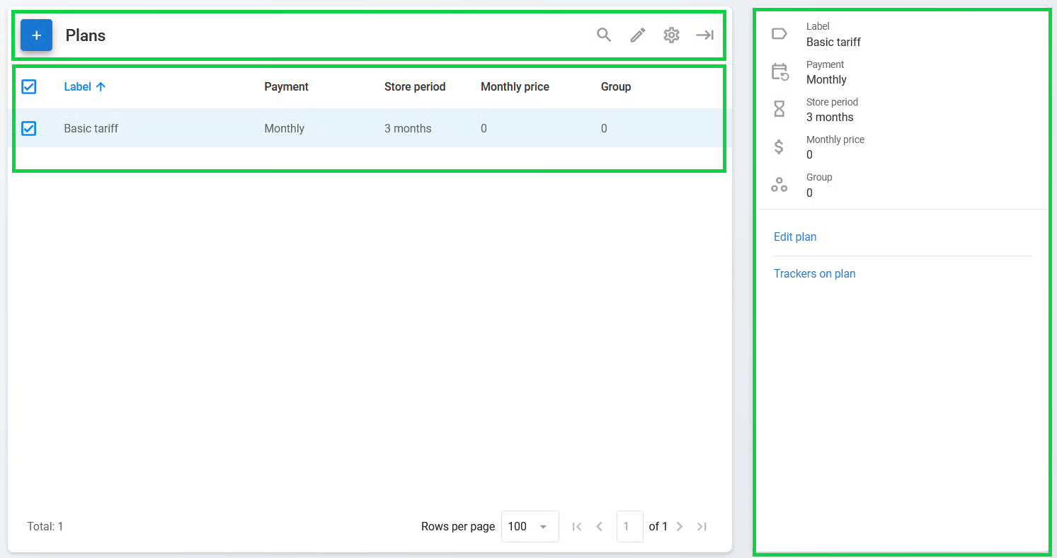 Le **Plans** page est utilisée pour consulter, créer et modifier de nouveaux forfaits tarifaires pour votre compte Navixy. Les forfaits tarifaires vous permettent de gérer les fonctionnalités disponibles pour vos utilisateurs finaux et de configurer la facturation. Vous pouvez créer autant de forfaits tarifaires que vous le souhaitez.