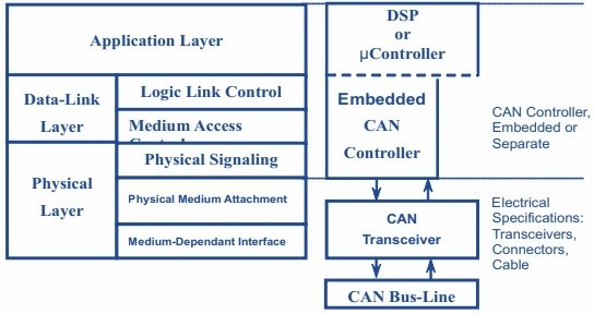 El protocolo de comunicaciones CAN ISO-11898:2003 explica cómo se transmite la información entre dispositivos en una red basada en un modelo Open Systems Interconnection (OSI) que se presenta como un conjunto de capas en la figura siguiente. Las dos capas más bajas del modelo OSI/ISO de siete capas son la capa física y la capa de enlace de datos. La capa física define la comunicación entre dispositivos conectados por el medio físico.