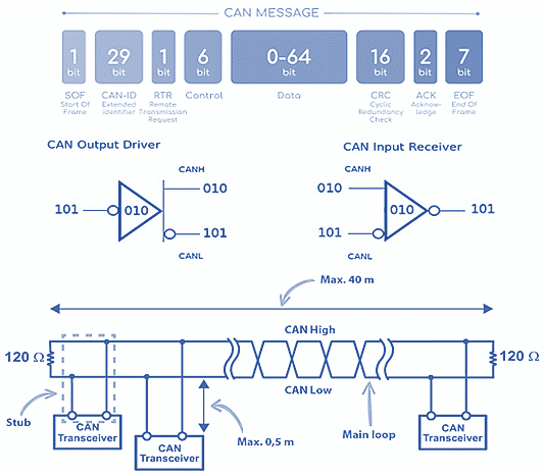 CAN se dividió en varias capas, siguiendo el modelo ISO/OSI para lograr flexibilidad y transparencia en el diseño. Para la comunicación en la práctica, el bus CAN utiliza dos hilos dedicados: CAN low y CAN high, mediante los cuales el controlador CAN se conecta a todos los componentes de la red. CAN permite sustituir un cableado bastante complejo por un bus de dos hilos. CAN utiliza una señal diferencial, lo que lo hace más resistente al ruido, con dos estados lógicos: recesivo y dominante. Hoy en día el bus CAN se utiliza prácticamente en todo, desde máquinas de café hasta las operaciones de gestión de flotas y aplicaciones espaciales. A continuación describimos brevemente los principios de funcionamiento del bus CAN.
