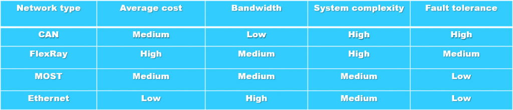 La comparación directa de los protocolos de conectividad listados muestra que existe una compensación clara entre ancho de banda y tolerancia a fallos frente a los costes promedio y la complejidad del sistema. Mientras que CAN y MOST siguen siendo una especie de protocolos fundamentales, FlexRay y Ethernet son una solución más prometedora para satisfacer las demandas crecientes del mercado y las aplicaciones de alta carga. En los vehículos modernos, esos protocolos se utilizan a menudo como soluciones complementarias.