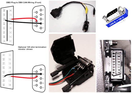 Un ejemplo de cableado desde el enchufe OBD al DB9 CAN incluyendo la resistencia de terminación opcional también se muestra en los esquemas a continuación.