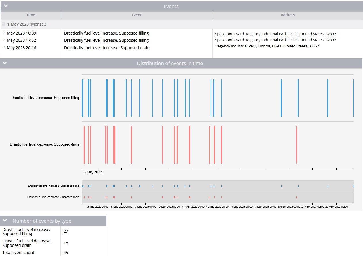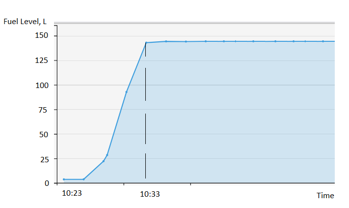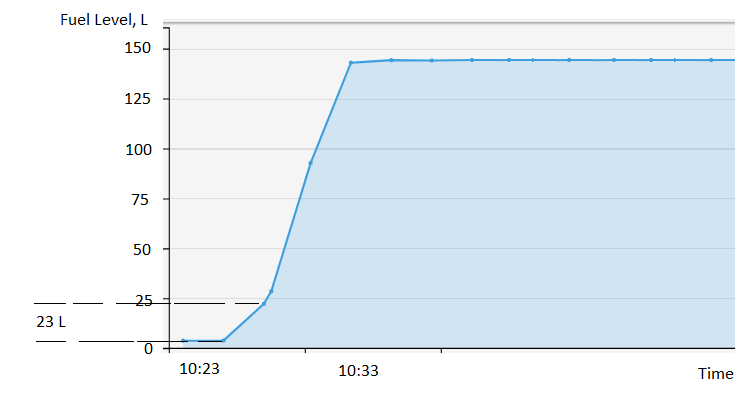 Si el nivel de combustible ha disminuido en más del error absoluto, se registrará un evento de "vaciado". Por ejemplo, si la capacidad del tanque es de 100 litros y la precisión es del 5 %, un cambio de 5 litros en el nivel de combustible dentro de un periodo de 10 minutos activará la regla.