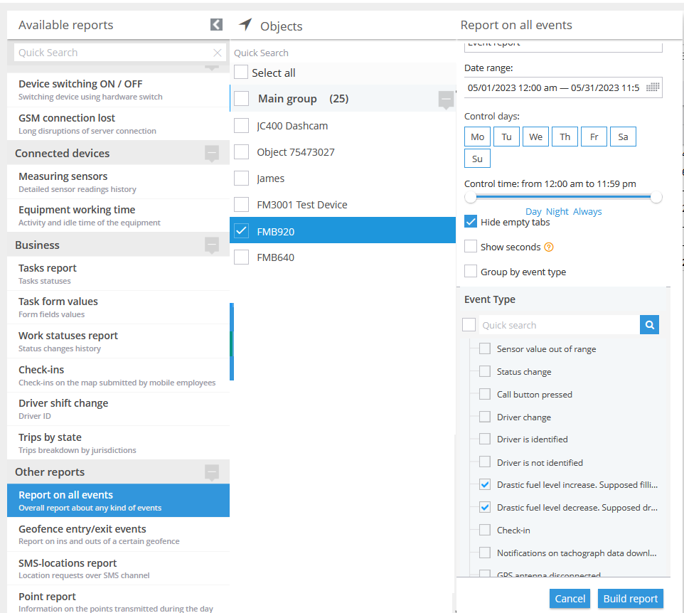 El propósito de esta regla es facilitar la monitorización en tiempo real del nivel de combustible notificando de manera oportuna cualquier cambio significativo, ya sean disminuciones o aumentos. Las notificaciones pueden enviarse vía interfaz web, SMS y/o correo electrónico, y también pueden consolidarse en informes. Al detectar cambios en el nivel de combustible, esta función permite a los usuarios mantenerse conectados con el rastreador y responder más rápidamente que si dependieran únicamente del informe de nivel de combustible. Lo cual, por supuesto, puede reducir los costes de combustible y resolver disputas laborales entre empleados.