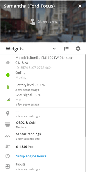 Si el rastreador está conectado al bus CAN o al conector OBD2, el widget mostrará toda la información disponible del vehículo. Nivel y consumo de combustible, revoluciones del motor, temperatura del refrigerante, testigo de avería (MIL), códigos de error (DTC), carga del motor, carga por eje, etc. Para mostrar los sensores, estos deben añadirse en el menú de configuración del dispositivo.