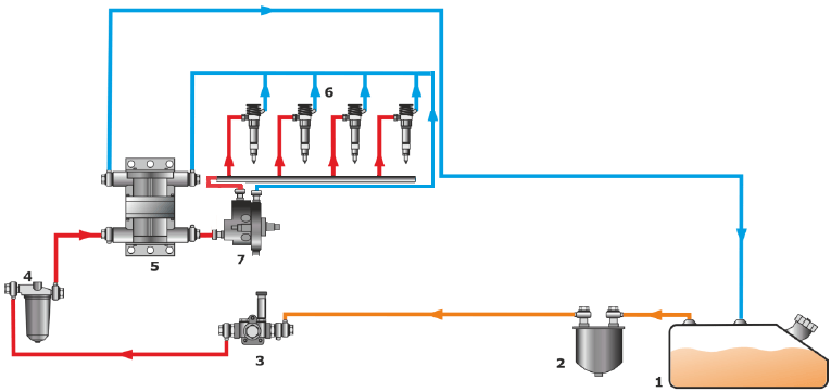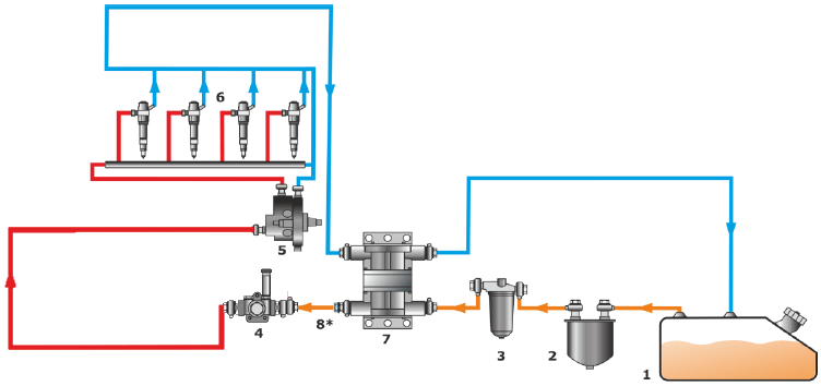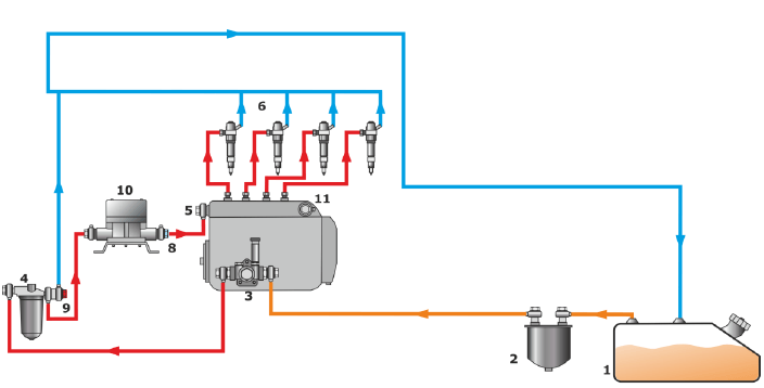 Un caudalímetro es un componente vital instalado en el sistema de combustible de vehículos o equipos especiales. Revisemos una vez más el esquema típico del sistema de combustible:
