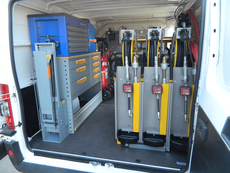 A menudo los equipos técnicos operan una estación móvil de calibración todo en uno, que cuenta con todo, desde tanques para vaciar el combustible hasta una estación de repostaje en un solo vehículo.