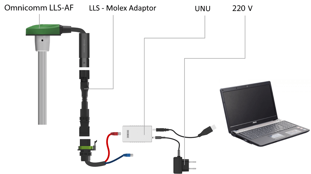 Kit de conector USB (para conectar el sensor y el portátil). Normalmente los fabricantes de sensores fabrican sus propios adaptadores USB (p. ej. UNU-USB de Omnicomm) para encajar en los sensores.