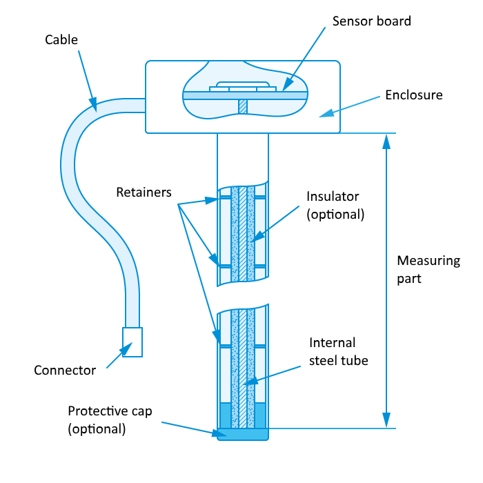Измерительная система состоит из двух труб, которые не соприкасаются физически. Одна труба вставлена в другую и выполняет роль обкладок конденсатора. Трубы с одного конца подключены к датчику, а с другого — оставлены открытыми; при этом они находятся под напряжением.
