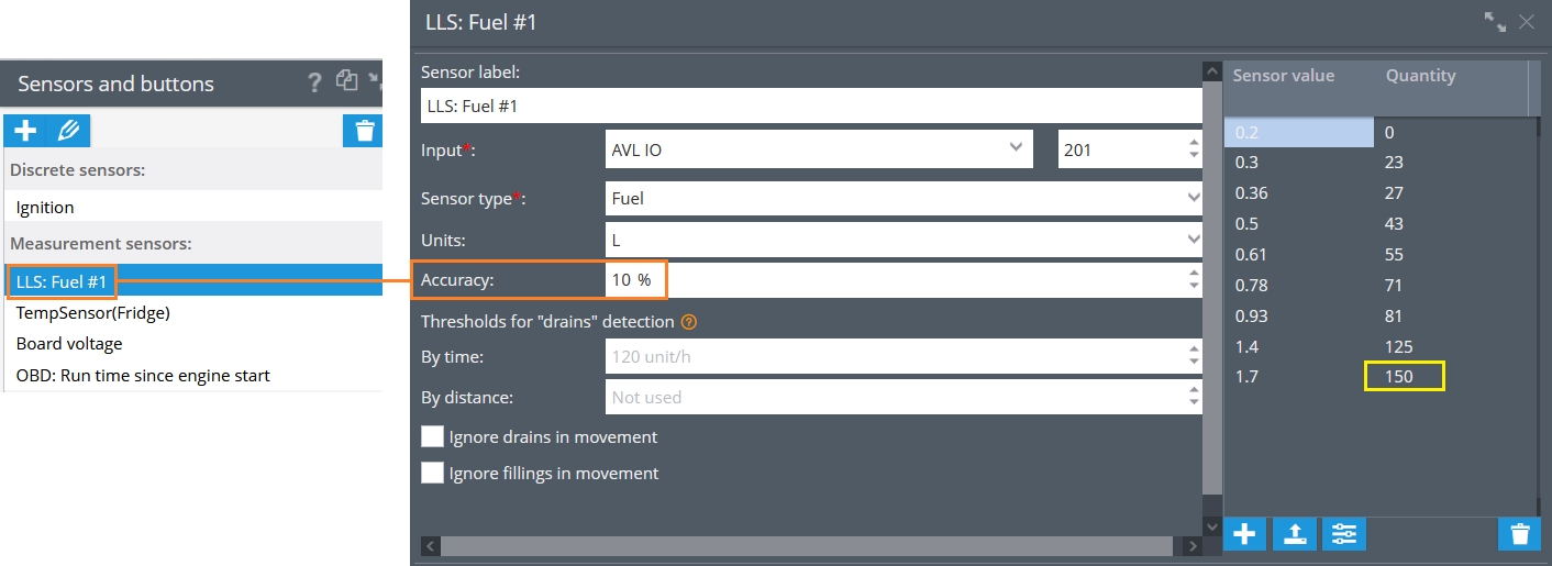 In the screenshot above, according to the calibration table, the maximum fuel tank is 150 L. This is the value that the Accuracy calculates the percentage of. If no calibration is provided, then it will be an absolute value of 100 units (in this case, would be 100 Litres). Based on the resulting of accuracy percentage value in selected units, the platform filters the incoming changes from this sensor and compares their sum within 10 minutes with the Accuracy resulting parameter.