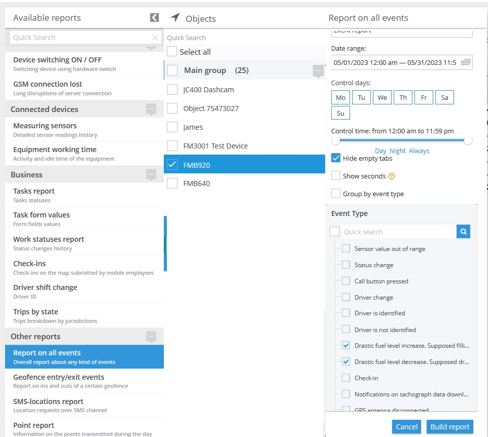 The "Fuel level change" alert has a 15-minute reset timer, meaning the alert event will not occur more often than once every 15 minutes. If this type of event occurs in time the rule has been waiting for the reset, this event will be omitted by the platform, including the reports.