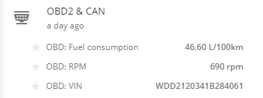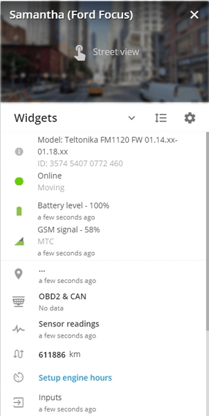 If the tracker is connected to the CAN bus or OBD2 connector, the widget will display all available information from the vehicle. Fuel level and consumption, engine speed, coolant temperature, malfunction lamp (MIL), error codes (DTC), engine load, axle load, etc. To display the sensors, they must be added to in the device settings menu.