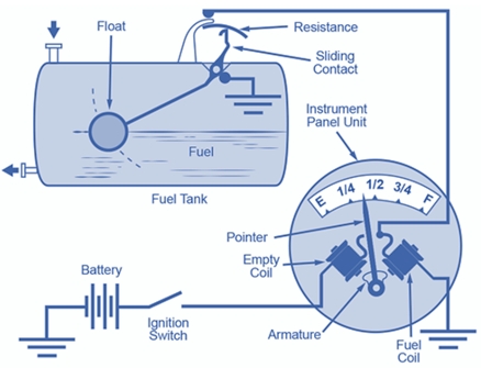 Various methods have been employed so far to measure fuel level: resistive film, discrete resistors, capacitive, ultrasonic, etc. Resistive-based sensors are among the most commonly used. These sensors are mechanically connected to a float which moves up or down depending on the fuel level. As the float moves, the resistance of the sensor changes, and the position of the needle changes proportional to the current flowing in the coil. A typical resistor-based FLS is shown in figure below.