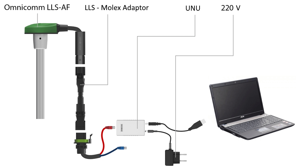 USB Connector kit (to connect the sensor and the laptop). Usually sensor manufacturers make their own USB adapters (e.g. UNU-USB by Omnicomm) to fit the sensors.