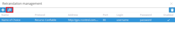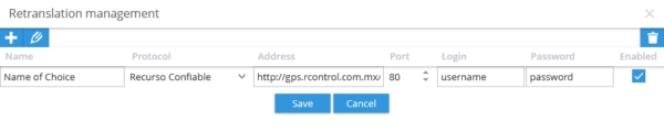 The Retranslation management screen should look similar to the following, with Recurso Confiable login and password. Make sure the Enabled button is checked and click the Save button to complete the process.