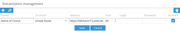 The Retranslation management screen should look like the following, with SimpliRoute login and password. Make sure the Enabled button is checked and click the Save button to complete the process.
