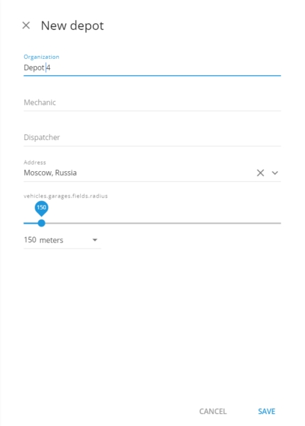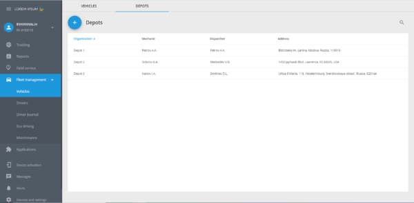 Nesta aba é possível adicionar e editar veículos, vinculá‑los aos pátios (depots) e conectá‑los a rastreadores ativados na plataforma.