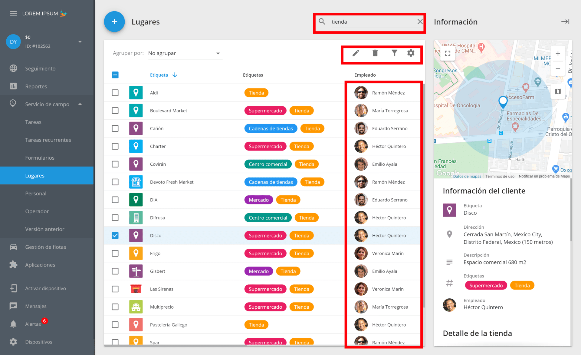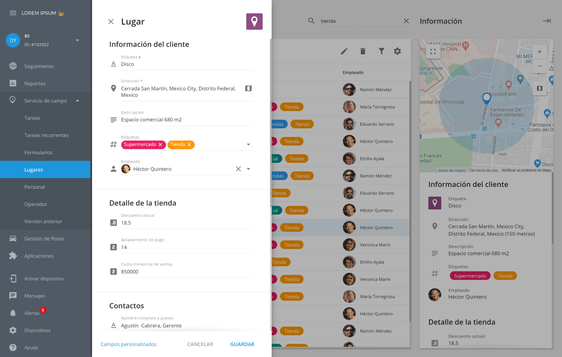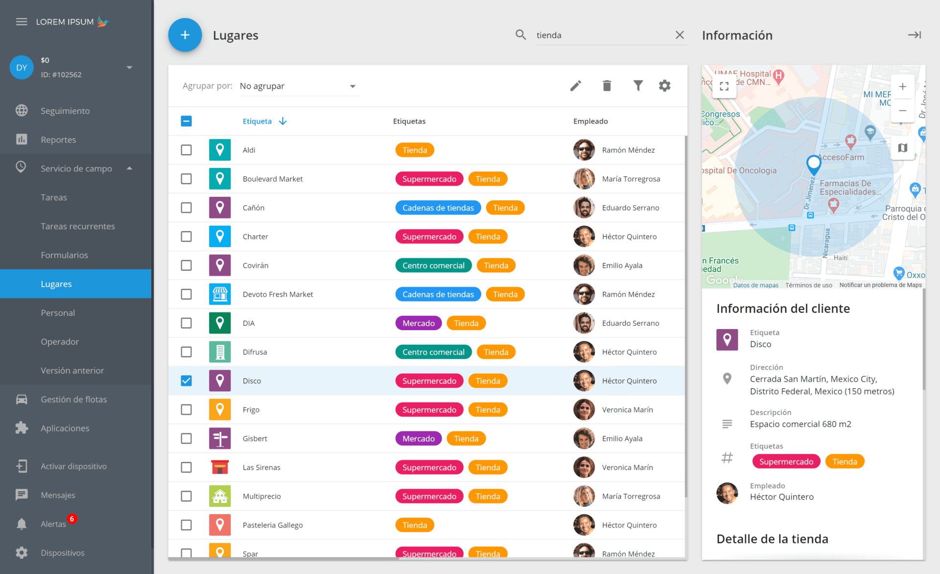 Ahora, con la introducción de los campos personalizados, las funcionalidades de los Lugares han ido mucho más allá. Es decir, cualquier empresa puede crear y personalizar su directorio de lugares (el nuevo módulo "Lugares") en el servicio agregando números de teléfono, correos electrónicos y otros datos relevantes del cliente. También existe una opción para importar la base de datos de clientes/lugares existentes de un archivo y asignar empleados al cliente.