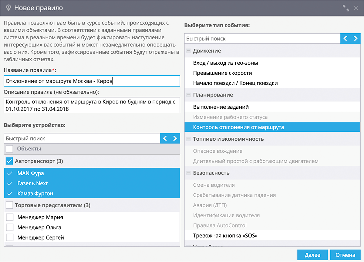 Незамедлительно узнавайте о важных событиях и вовремя реагируйте на изменения. Для получения уведомлений достаточно создать новое правило: выберите нужные объекты и событие из списка.