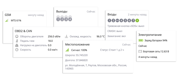 Используйте наглядную онлайн панель бизнес-аналитики. Мгновенно оценивайте и реагируйте на текущую ситуацию: работа двигателя, состояние груза, поломки ТС и др.